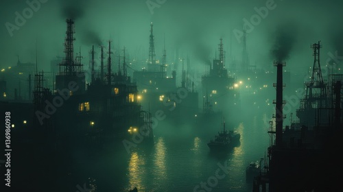 industry, factory, smog, fog, night, dark, city, dock, harbor, water, ship, vessel, pollution, environment, urban, industrial, landscape, atmosphere, mystery, secret, shadow, green, teal, twilight, darkness, gloomy, eerie, ominous, hazy, misty, dreamlike, surreal, port, dockyard, silhouette, factory, smokestack, light, building, structure