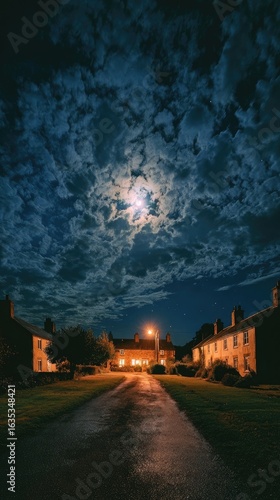 night, moon, village, house, street, road, full, cloud, sky, light, dark, calm, peaceful, rural, exterior, landscape, photo, photo, gold, yellow, orange, illuminated, building, home, tree, grass, lawn, path, urban, country, residential, evening, twilight, cloudy, quiet, still, blurry, soft, ambience, atmosphere, tranquil, serene, mystery, magic, dreamy, rustic