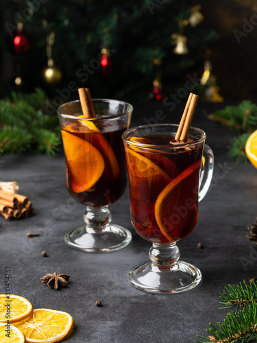 Non alcoholic Mulled wine (gluhwein) with orange slices, anise stars, spices and cinnamon sticks on dark background with spruse branches, clove and pepper. Christmas and new year card.