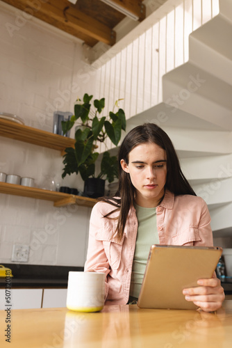 Non-binary trans woman with coffee cup using digital tablet in the kitchen at home