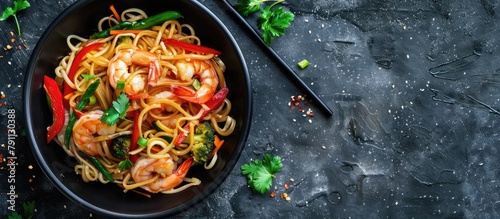 Noodles and vegetables stir-fried with shrimp in a black bowl, against a slate background. Viewed from above with space for text.