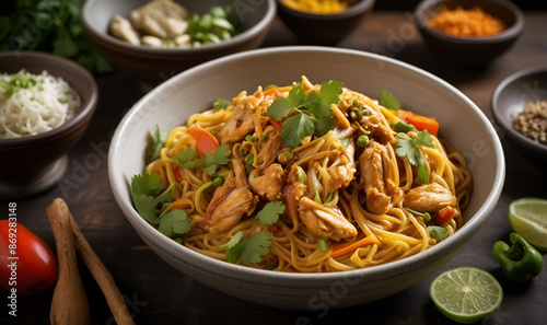 noodles with pieces of chicken meat and herbs, in a plate on a wooden table