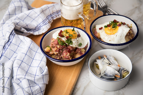 hamburger, beer, glasses, stew, beefsteak, potato, cucumber, red, bed, rollmop, herring, fried egg, dish, food, meal, kitchen, local, traditional, bremen, german, north, german, beef, rind, meat, hearty, peeling, enamel, 2, 2, clothes, flatware, marble, table, bright, wooden board, background