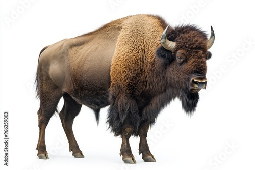 North American bison stands tall and proud, its thick, wooly mane contrasting sharply against a pristine white background. The muscular frame embodies the essence of wilderness and strength.