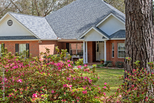 North Florida Residential Colonial Brick House with Blooming Azaleas