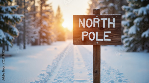 North Pole sign in snowy forest during golden hour