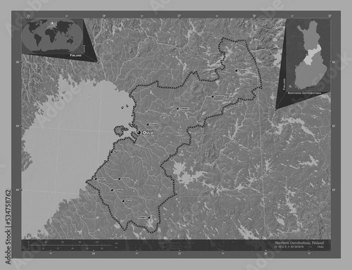 Northern Ostrobothnia, Finland. Bilevel. Labelled points of cities