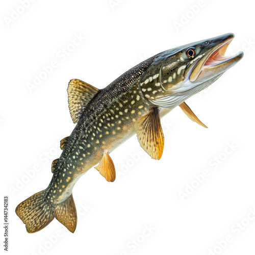 Northern pike swimming in clear water during daytime showcasing vibrant colors and sharp teeth