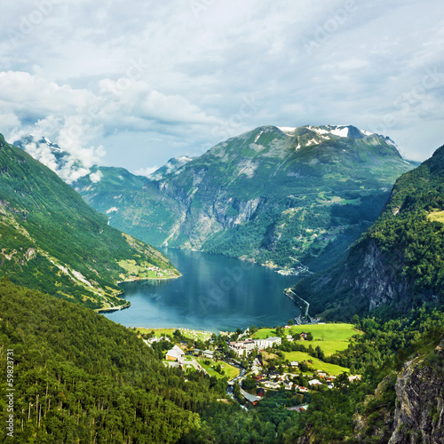 Norway landscape Mountains and village in Geiranger fjord.