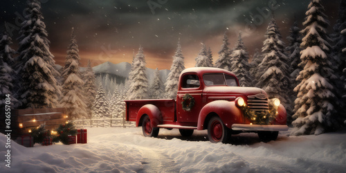 Nostalgic Holiday Ride: Red Truck in Snowy Christmas Scene
