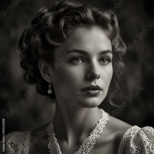nostalgic, photo, black-and-white, woman, vintage, retro, old-fashioned, classic, timeless, sentimental, melancholy, romantic, dreamy, whimsical, model, portrait, fashion, beauty, hair, person, glamour, face, coiffure, make-up, people, lady, studio, elegance, style