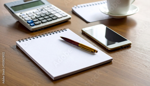 Note and ballpoint pen smartphone calculator cup on wooden desk.