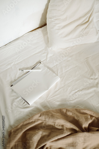 bed, bedchamber, blanket, daylight, hand, linen, morning, notebook, paper, pen, planning, ring, sheet, white, woman's hand, writing