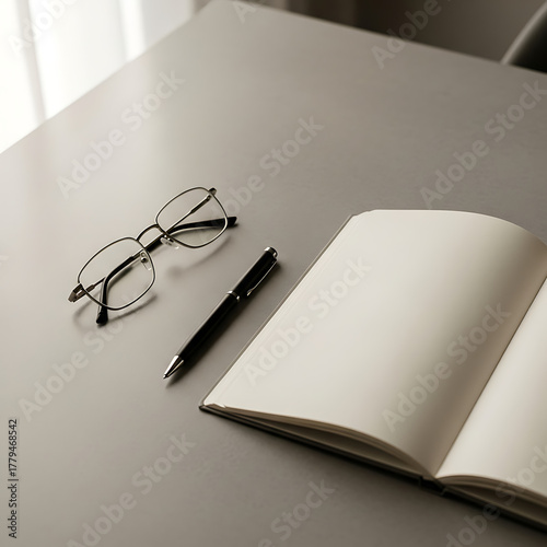 Notebook with Blank Pages and Glasses on Minimalist Workspace Desk Top View Education Office Workplace Empty Copy Space