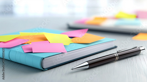 Notebook with Colorful Sticky Notes and Dark Ballpoint Pen on Neutral Desk Workspace Management