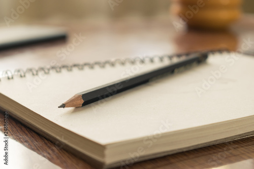 Notebook with drawings and pencil on wooden table.