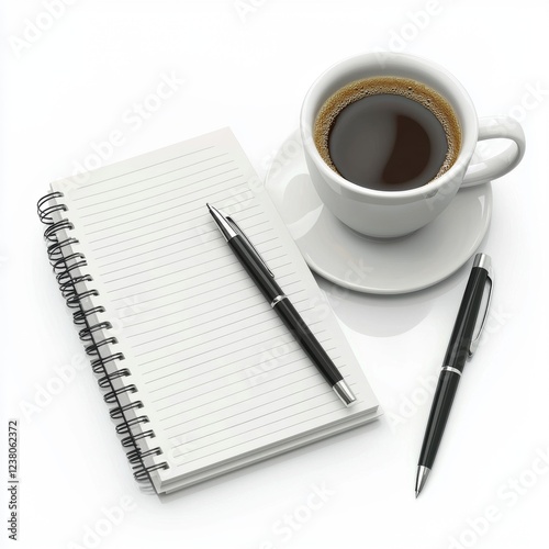 Notepad and pen next to a cup of coffee, symbolizing productivity, placed on a bright white background