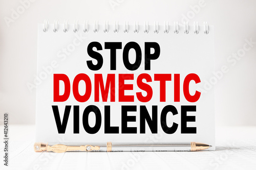 Notepad with inscriptions STOP DOMESTIC VIOLENCE on a white background. business concept.