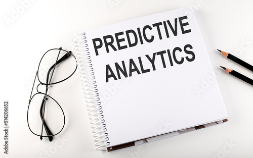 Notepad with text PREDICTIVE ANALYTICS. White background. Business concept