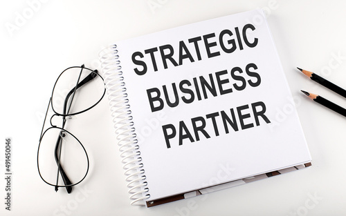 Notepad with text STRATEGIC BUSINESS PARTNER . White background. Business concept