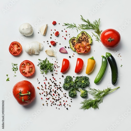 up high, assorted, assortment, background, broccoli, collection, concept, cook, cooking, cookery, diet, food, fresh, garlic, health food, healthy, healthy eating, ingredient, isolated, oil, onion, spice, tomatoes, vegetable, white