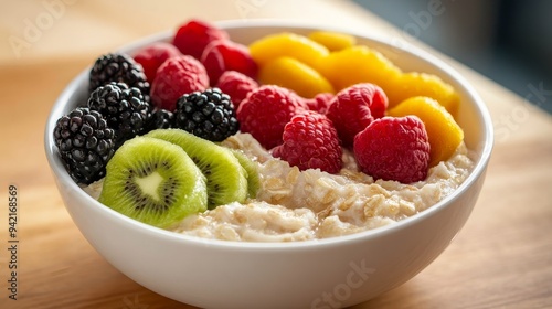 Nourishing morning meal featuring oatmeal enhanced with a medley of fresh fruits. [992] --ar 16:9 --v 6.1 Job ID: daa763e7-710e-4f5a-a59c-4ae4daefd80b