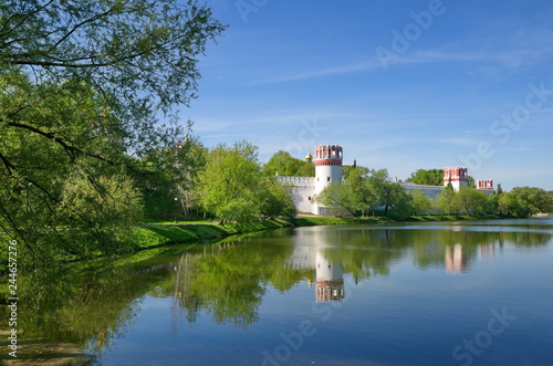 Novodevichy convent and Big Novodevichy pond on a Sunny spring day. Moscow, Russia