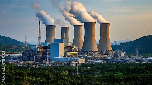 Nuclear energy facility with towering cooling systems and exhaust stacks, located in a remote industrial area