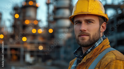Nuclear industry worker against the background of a nuclear power plant, physicist, employee portrait, man, pipes, technology, equipment, science, scientist, uniform, helmet, builder, engineer