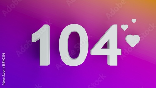 Number 104 in white on purple and orange gradient background, social media isolated number 3d render
