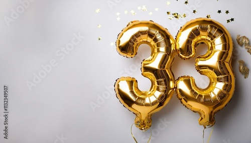 Number 33 golden balloons on white background with copy space. Generated image