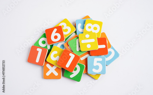 Number wood block cubes for learning Mathematic, education math concept.