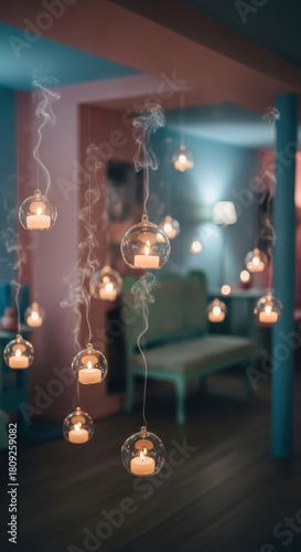 Numerous glowing tea lights illuminate a darkened room from suspended glass orbs emitting faint smoke trails