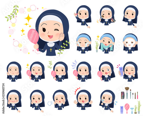 woman, people, sister, nun, sister, abbey, christianity, religion, catholic, cristian, beauty, cosmetic, skincare, skin, face, make-up, teak, foundation, towel, wipe, packet, este, acne, good, smudge, freckle, fold, ageing, barbed, shave, trouble, resolution, character, sweet, flat, vector, affinity