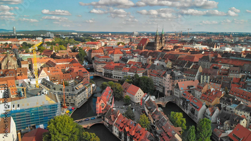 Nuremberg, Germany. Drone aerial view from a vantage viewpoint along city river