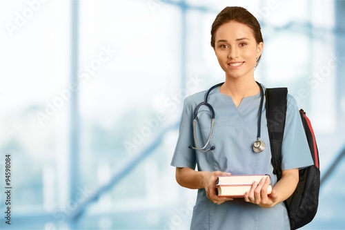 nurse, student, education, college students, doctor, book, isolated, asian ethnicity, adult, cheerful, young adult, backpack, female, happiness, woman, people, smiling, one person, vertical, ethnic, stethoscope, cut-out, white background, textbook