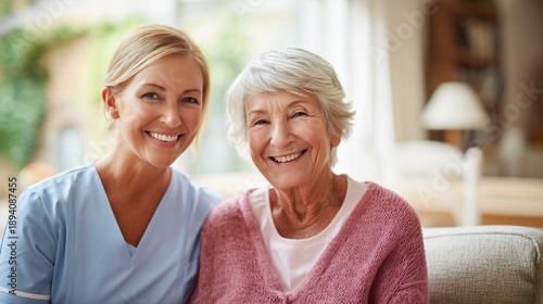 Nurse and elderly woman smile together in a cozy living room during a care visit