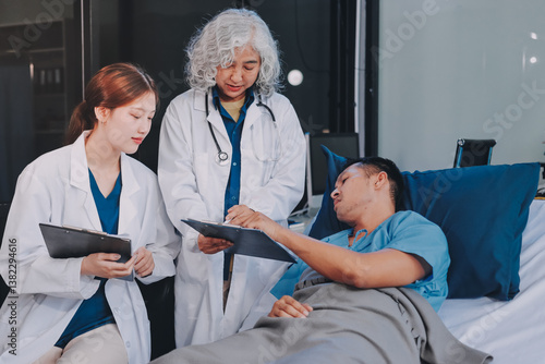 Nurse giving assistance to senior patient with disease in bed. Medical assistant and doctor doing healthcare checkup for pensioner with oxygen tube and IV drip bag in hospital ward.