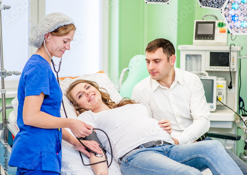 Nurse measuring pressure of pregnant woman. Husband supports pregnant wife for examination