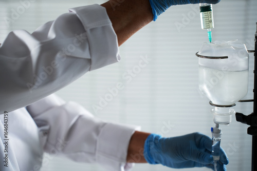 Nurse prepares a medication for IV Drip for patient. Medical care and treatment concept.