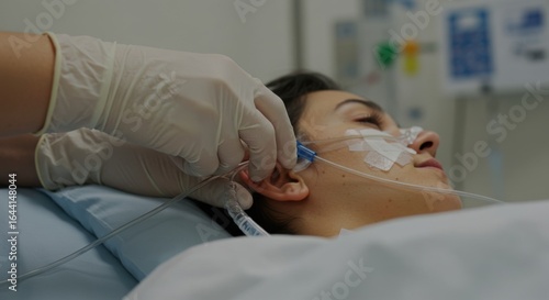 patient, nurse, hospital, medicals, health care, care, treatment, woman, bed, sick, disease, recovery, icu, intensive care, doctor, hand, glove, sterile, oxygen, tube, respiratory, breathing, support, procedure, emergency, critical, unconscious, asleep, helping, monitoring, adjusting, clinical, ward, equipment, face, tape, pillow, gown, life, health, professional, medicine, therapy, compassion