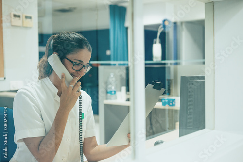Nurse speaking by phone in her workplace office