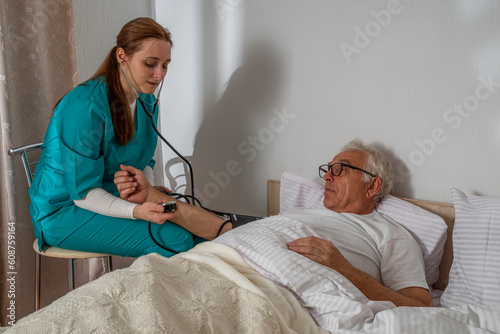Nurse taking blood pressure of elderly man at his home. Solicitous professional medical female staff caring for senior patient. Lifestyle, nursing service
