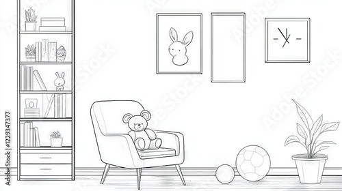 childcare center, line, art, illustration, modern, scandinavian, furniture, arrangement, retro, armchair, teddy, bear, tall, bookshelf, organised, shelf, classic, baby, crib, design, three, drawer, dresser, wall, mounted, clock, detail, framed, rabbit, artwork, minimal, stool, bouncy, ball, toy, contemporary, table, lamp, detailed, outline, style, architectural, interior, vignetting, clean, minimalist, drawing, technique