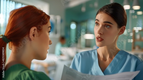 health care, teamwork, hospital, doctor, health, woman, document, collaboration, meeting, medicals, uniform, female, indoor, care, clinic, discussion, nurse, holding, professional, consultation, communication, working, serious, staff, partnership, scrub, expertise, focused, conversation, advice, job, assistance, cognition, engaged, talking, interact, intensive, guidance, sharing