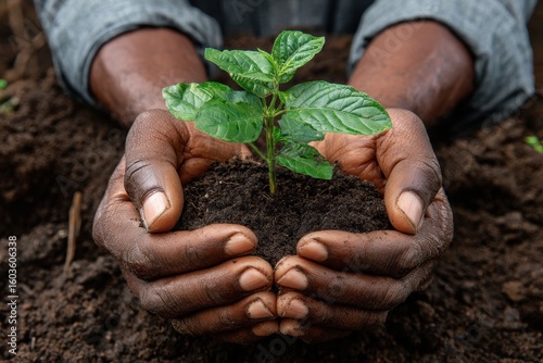 Nurturing a young sapling in earthy soil with caring hands symbolizing growth and hope