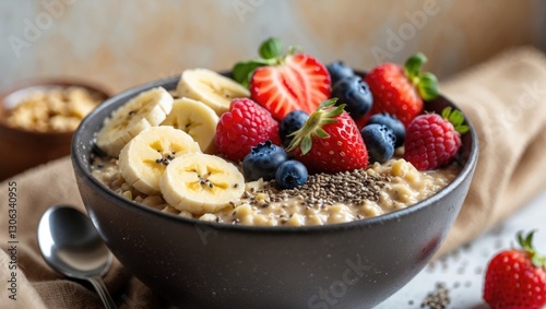 Nutritious homemade oatmeal topped with banana slices, blueberries, raspberries, strawberries, and chia seeds