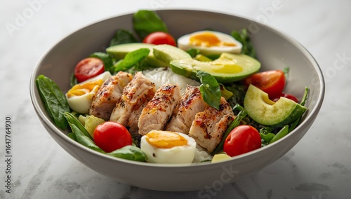 Nutritious Salad Bowl with Grilled Chicken, Runny Boiled Eggs, Avocado, Cherry Tomatoes, and Spinach – Fresh and Balanced Meal Captured in Vibrant Detail Using Generative AI