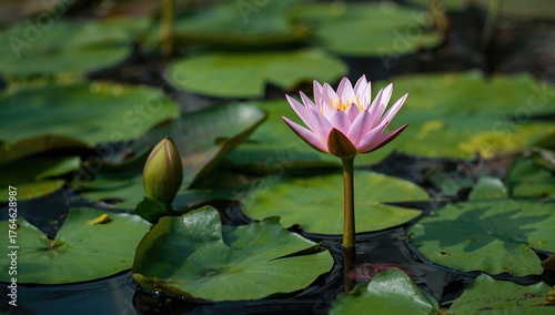 Nymphaea is an aquatic plant featuring large subterranean stems, with leaves and blooms emerging from buds at the water's surface in equal measure.