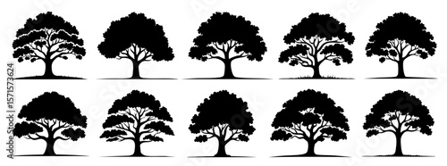 Oak Tree Silhouette Collection with Thick Trunks and Dense Leafy Canopies, Solid Black Vector Illustrations for Nature, Forest, and Landscape Design on White Background